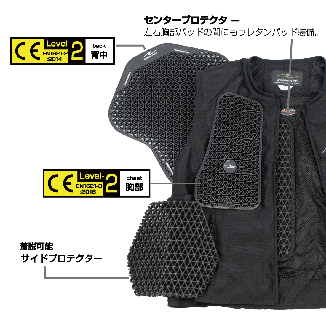 胸部、背中に高い柔軟性と通気性を併せ持つCEレベル2認証プロテクターを標準装備したプロテクションベスト。