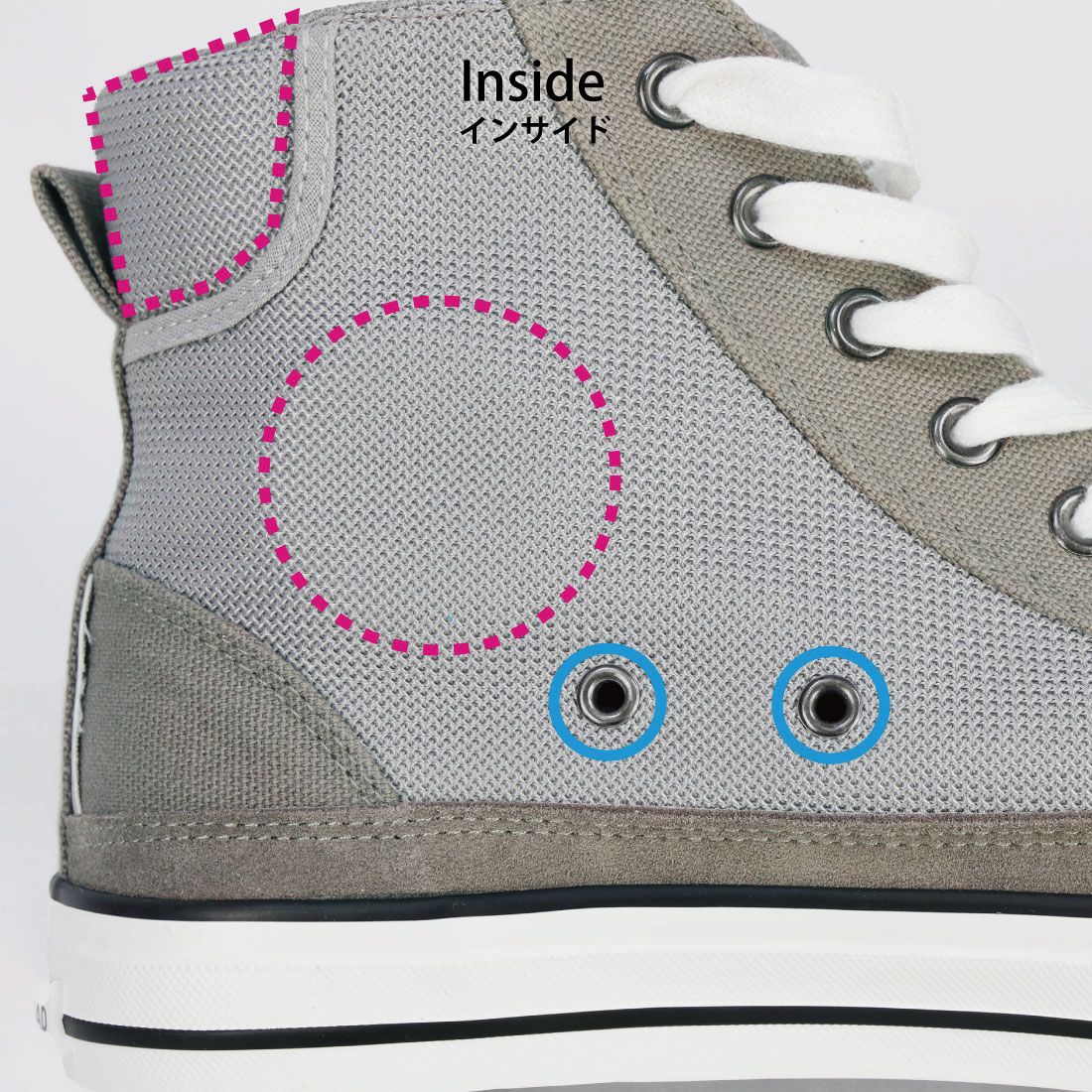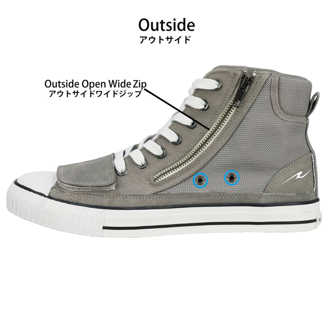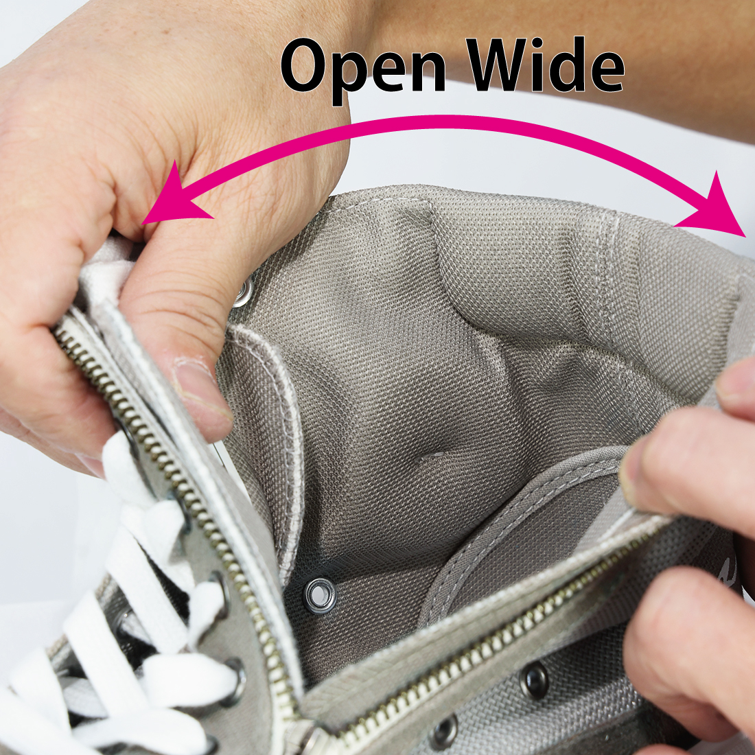 大きく開くファスナーは脱ぎ履きラクラク