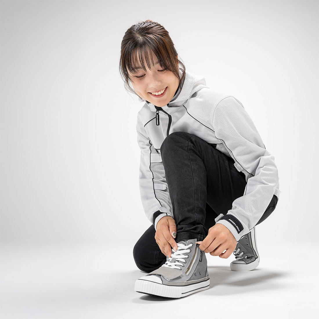 ツーリング等で名所・旧跡等も躊躇なく行けるさりげないデザインの、オンライドとオフライド仕様。メイン素材は、酷暑の夏でも涼しく快適なメッシュ素材採用。斜めに大きく開くファスナーは靴ひもをほどく必要がなく脱ぎ履きのしやすさが抜群です。しかも外側ファスナー仕様なので車体を傷つける心配がありません。踵にはリフレクターを装備し、視認性を確保。また、くるぶし内側に厚めのクッションを入れ車体をホールドしやすくしています。左足に装備した大きめのシフトガードは、幅5.5センチとシフト場所の個人差にも余裕で対応。また表面に凹凸のある立体カップインソールを採用し、通気性とクッション性を高め快適さが向上。