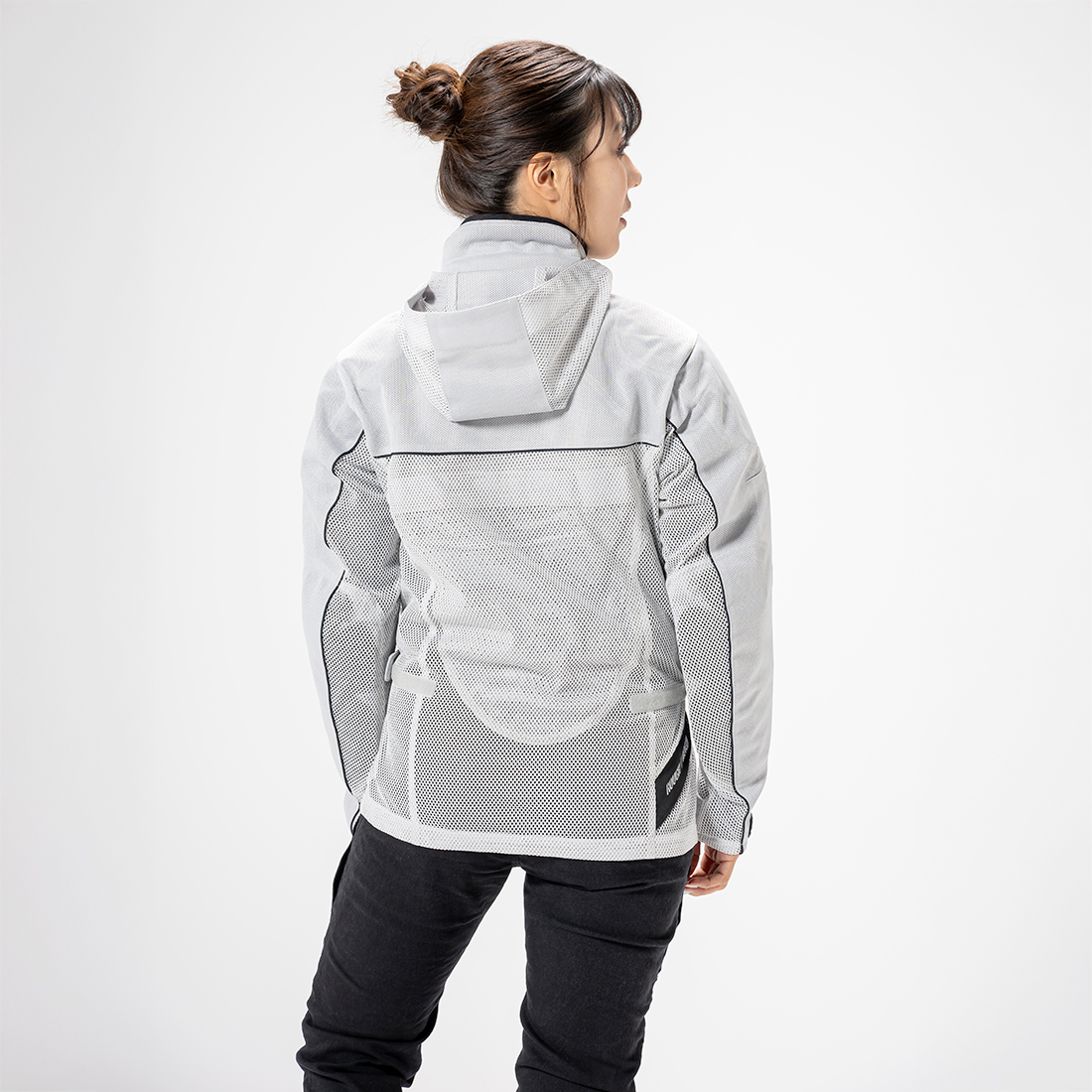 ライディングへの集中を妨げる酷暑からライダーを解放する究極のメッシュジャケット、ダイレクトエアシリーズのパーカータイプ。メイン素材にビッグホールメッシュ生地を採用し、大量のフレッシュエアをダイレクトにボディへ導き瞬時にクールダウン。肩から袖にかけてはスパックスメッシュを使用し、従来モデルより耐久性を向上。裏地を省き、胸・肩・肘・背中にエアスルーパッドを標準マウントし、安全性と通気性をとことんまで突き詰めた、”放熱”するために生まれた酷暑対応のサマージャケットです。