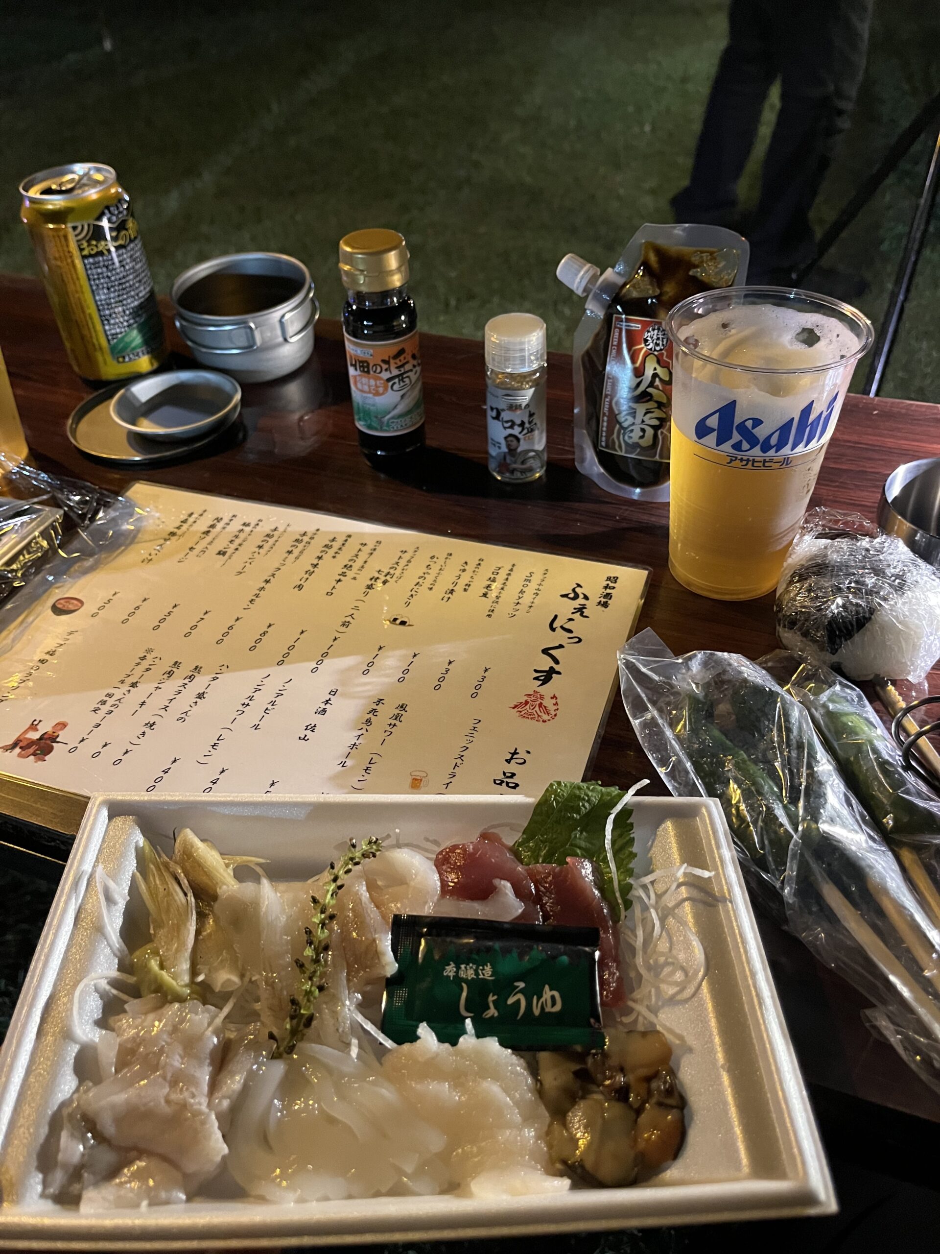 プロの板前さんが準備したお刺身セットや社長のお母さんが握ったおにぎりなど