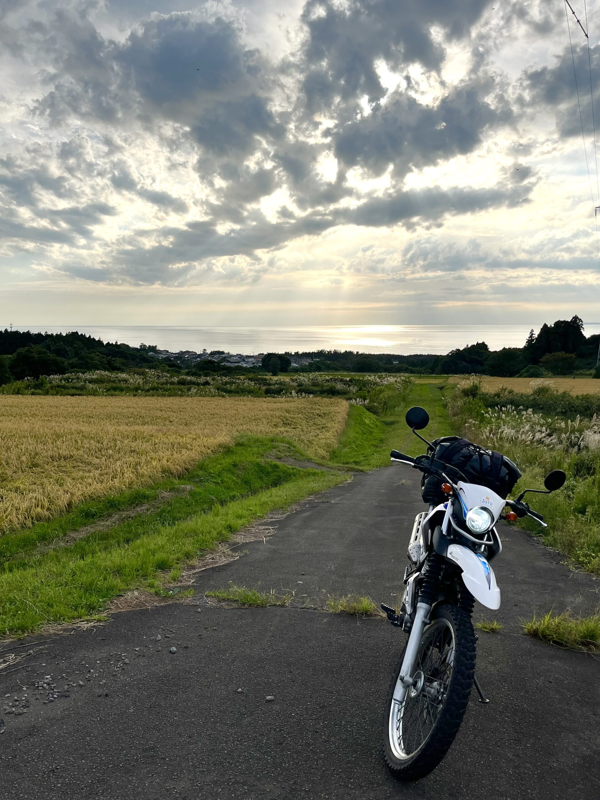 仁賀保で下され7号線へ戻される途中、田んぼの向こうに沈みゆく夕陽と日本海。