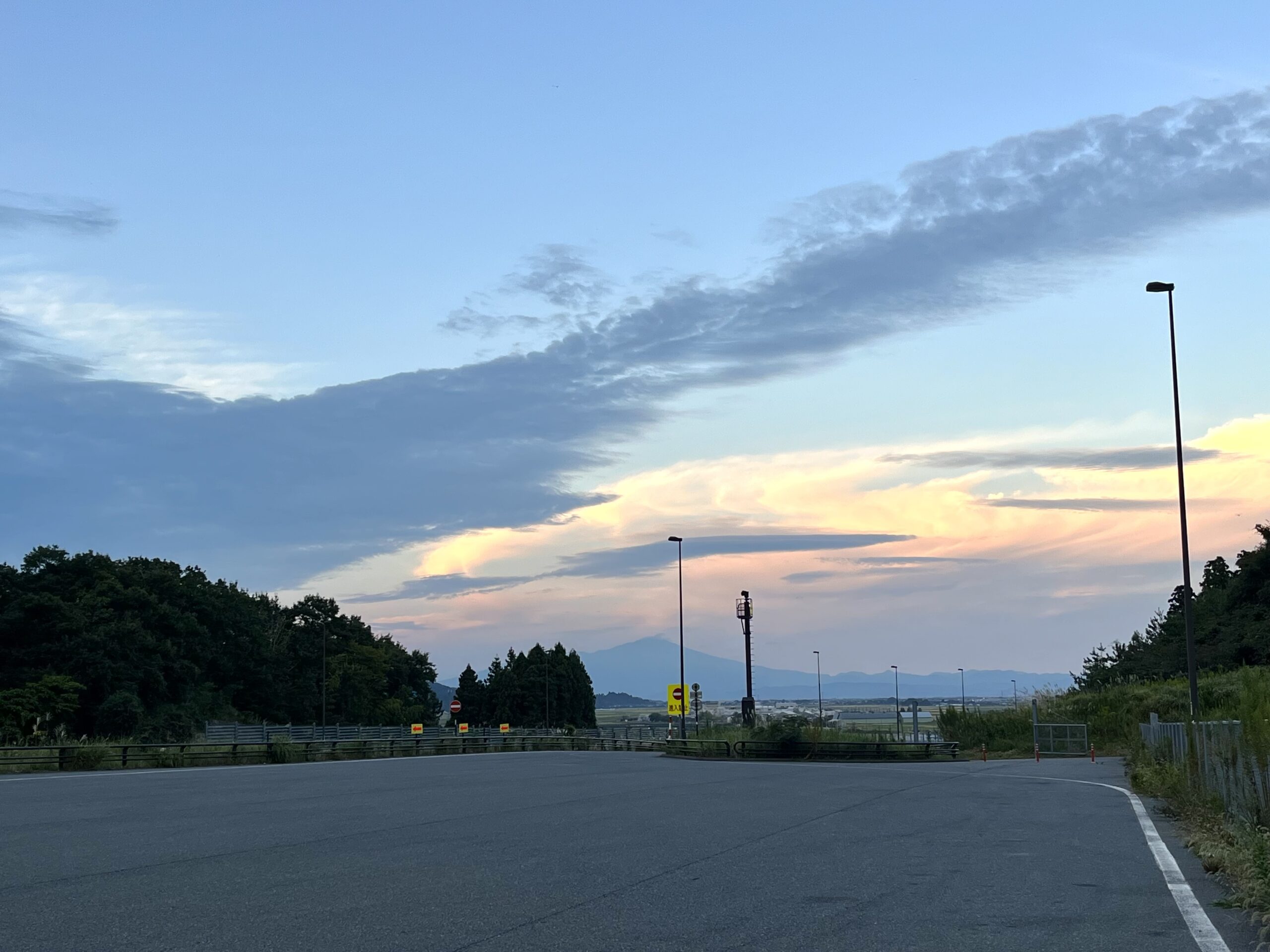 背後に暮れゆく鳥海山を眺めつつ鶴岡あたりで夜がやってきました。