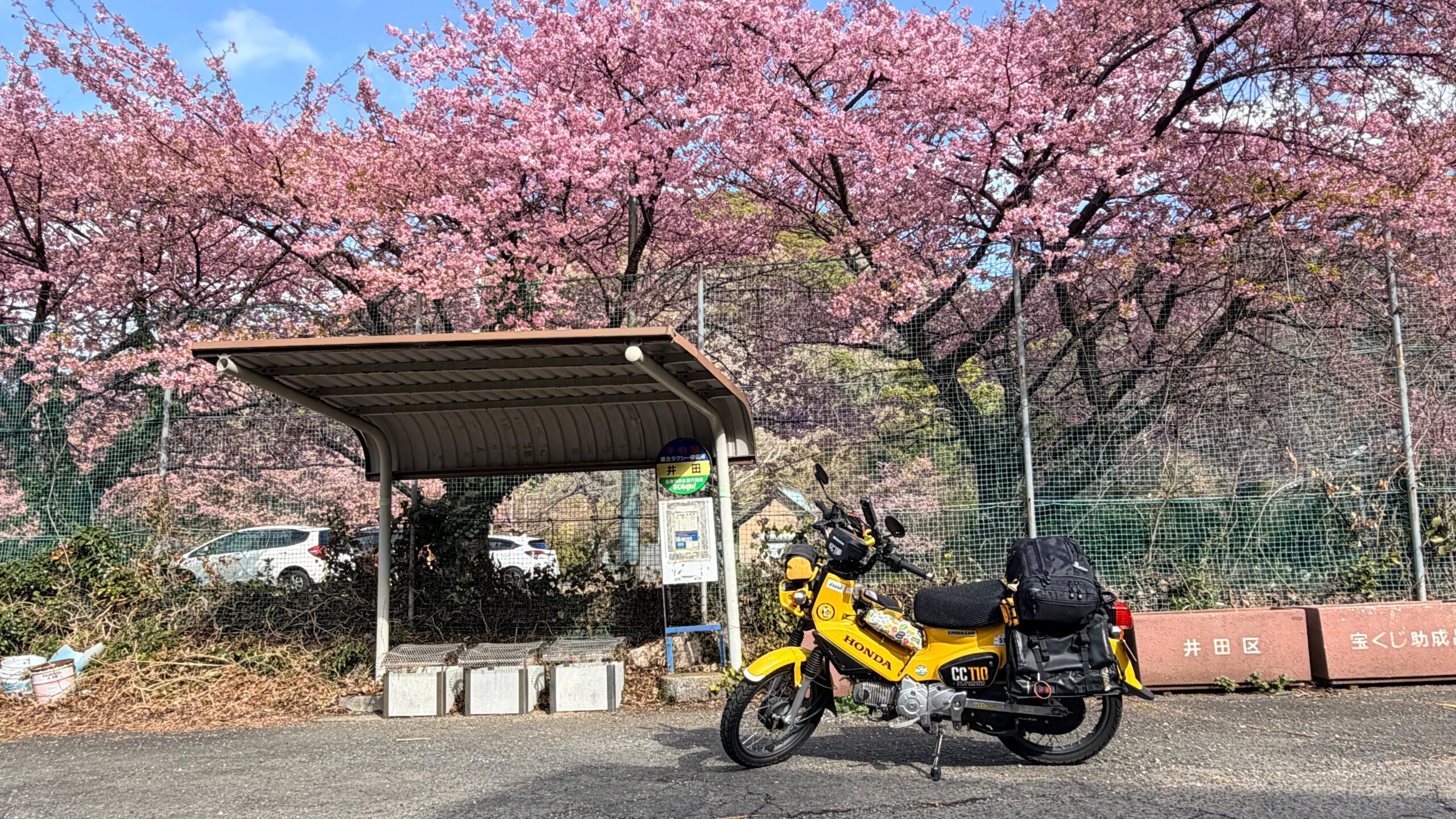 菜の花畑を越えて、元の県道17号に出る道の両側にはたくさんの河津桜が満開で素敵な桜のアーチになっていました。