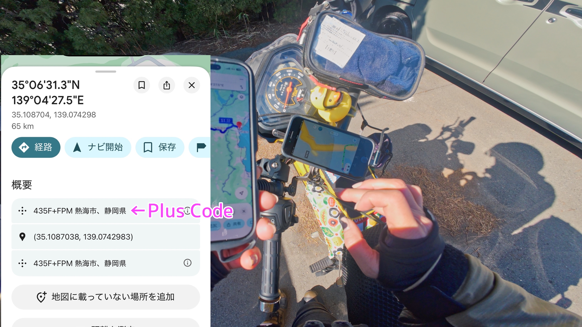 ちなみに、ツーリングサポーターは座標検索ができないため一度Googleマップで座標検索しGoogleマップに表示される「Plus Code」をコピーしてツーリングサポーターに貼り付けます。